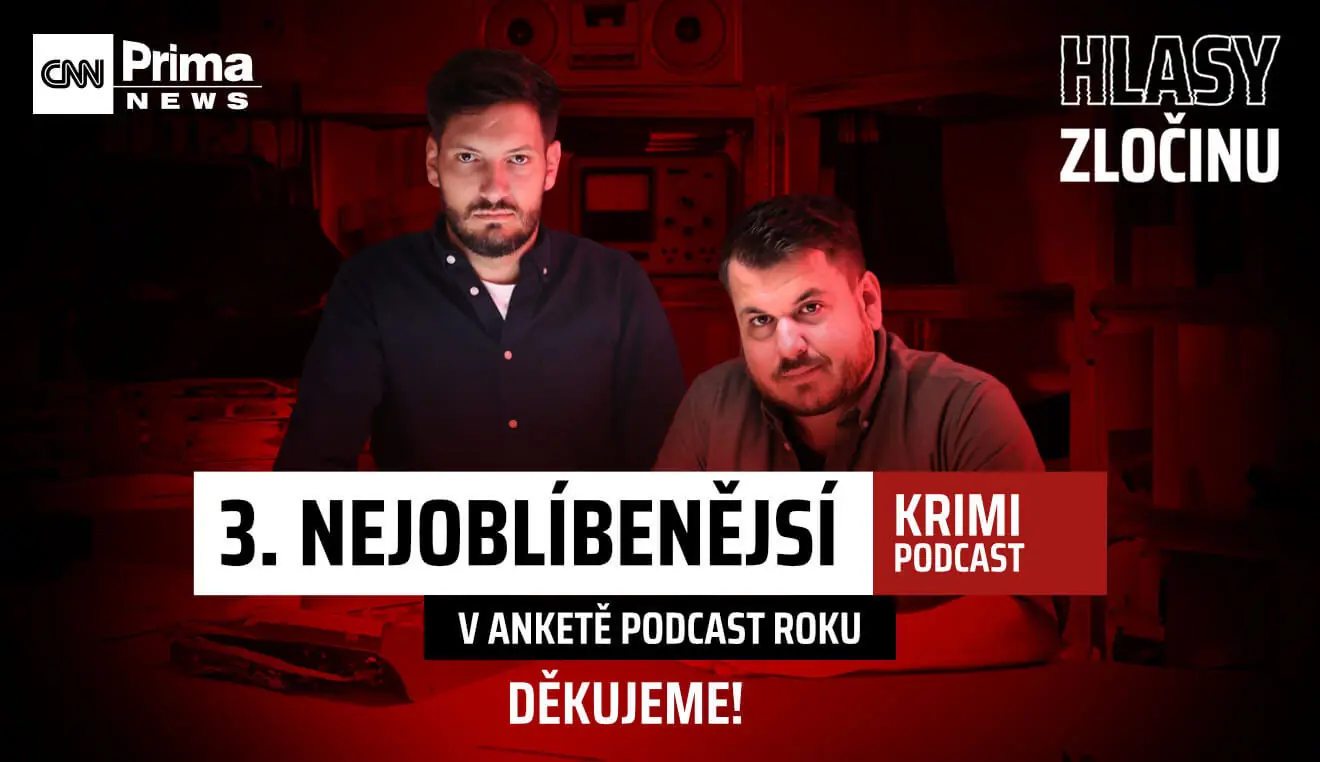 Oblíbený true crime video podcast HLASY ZLOČINU multiplatformy CNN Prima NEWS slaví další úspěch. Diváci a posluchači ho zvolili třetím nejoblíbenějším krimi podcastem v anketě Podcast roku. Moderátorům a tvůrcům pořadu Jakubu Kvasničkovi a Václavu Janatovi se dlouhodobě daří fascinovat diváky nahlížením do hlav těch nejhorších českých zločinců a vrahů. Díky atraktivnímu obsahu mají HLASY ZLOČINU silnou diváckou základnu. V květnu zaznamenaly už víc než 25 milionů přehrání na nejpopulárnějších podcastových platformách
