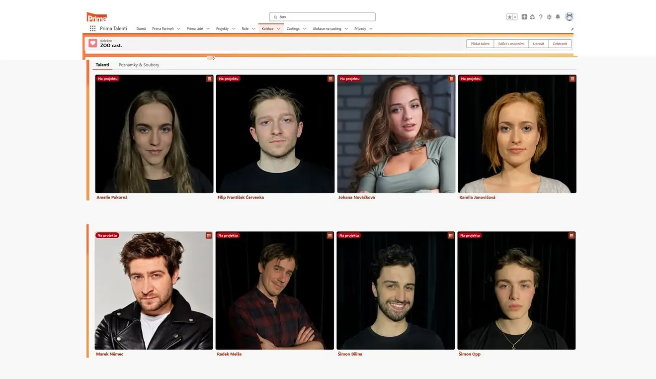 Prima databáze, vyvíjená ve spolupráci se společností CGI, za první měsíce své existence již obsahuje více než 3 000 herců a hereček, včetně dětských tváří. Tento nástroj umožňuje rychlou a efektivní komunikaci mezi výrobním oddělením a tvůrci pořadů, zároveň zajišťuje kontrolu nad duplicitou obsazování v současně natáčených projektech a podobných rolích. V případě neočekávaného výpadku člena obsazení nabízí databáze flexibilní a rychlé řešení přeobsazení.