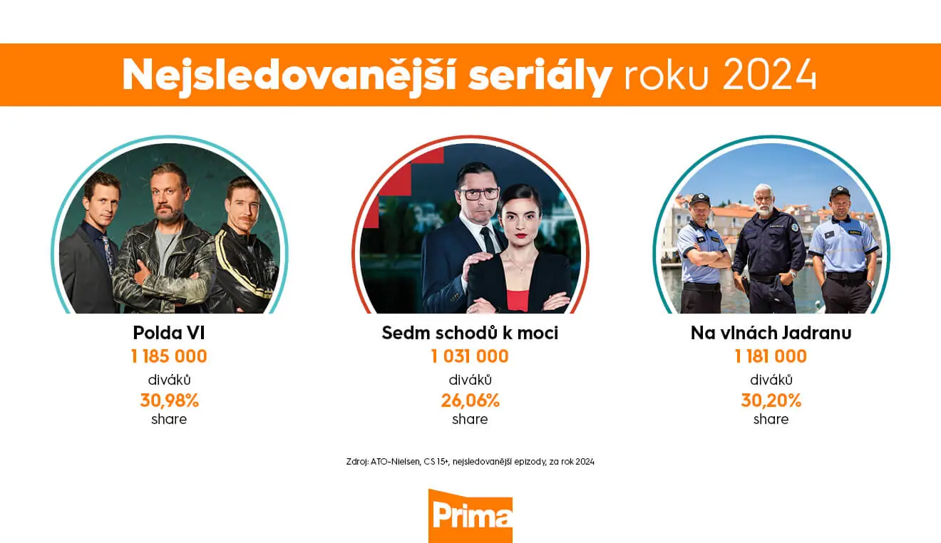 Skupina Prima dosáhla v roce 2024 na celodenní share 26,83 % v CS 15+ a 25,32 % v CS 18–69. Prime time share loni činil 25,67 % v CS 15+ a 24,65 % v CS 18–69. Nejlepším měsícem roku 2024 byl pro skupinu Prima březen, kdy si v CS 15+ připsala celodenní share 28,24 %. Mimořádně oblíbené byly u diváků v CS 15+ nové pořady vlastní tvorby. Šestá série krimiseriálu Polda s Davidem Matáskem v hlavní roli byla nejúspěšnější ze všech řad a průměrně ji sledovalo 1 115 000 diváků při sharu 29,97 %. Nejsledovanější díl Poldy VI vidělo 21. února 1 185 000 diváků při sharu 30,98 %, díky tomu se stal i nejsledovanějším pořadem na Primě v roce 2024. Seriál Na vlnách Jadranu sledovalo průměrně také přes milion diváků, konkrétně 1 051 000 při sharu 27,56 %. Nejsledovanější díl vidělo 10. ledna 1 181 000 diváků při sharu 30,20 %. Se seriálem ZOO se rozloučilo 813 000 diváků při sharu 23,74 %. Poslední díl Zrádců si v cílové skupině 15–40 připsal share 34,35 %. Alespoň tři minuty tohoto pořadu viděly přes dva miliony diváků v CS 15+.